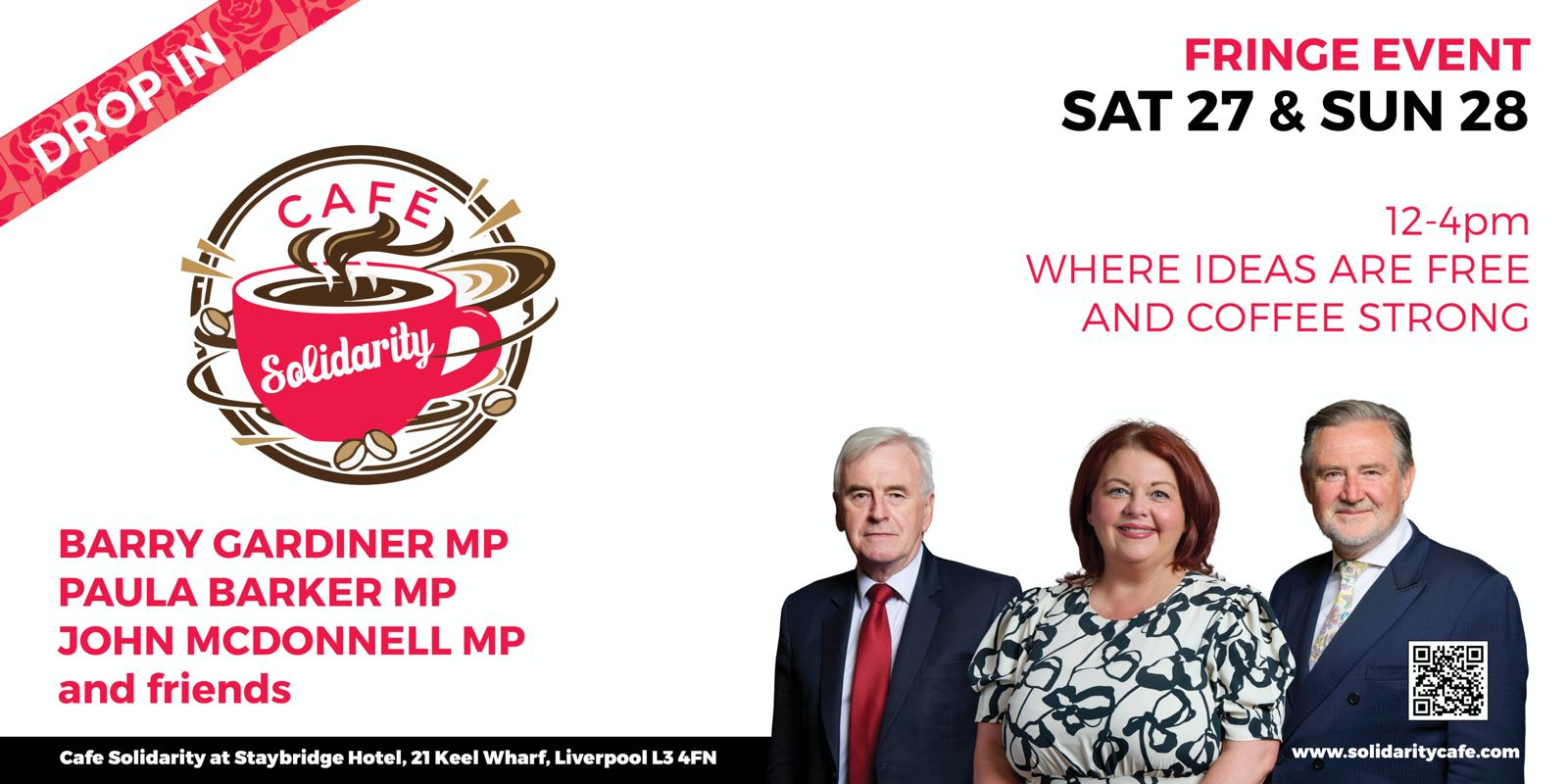 Solidarity Café is run by Barry Gardiner MP, as a pop-up Labour Party Conference FRINGE event on Saturday 27 and Sunday 28 September 2025 between 12noon and 4pm each day.